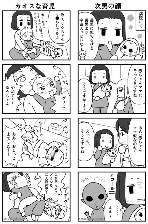 ・ウチュウジンモカワイイヨ~。まあ、生まれたばかりの赤ちゃんは、サルとか宇宙人とか似てるよね。長男の顔はパパ似、次男の顔はママ似です。