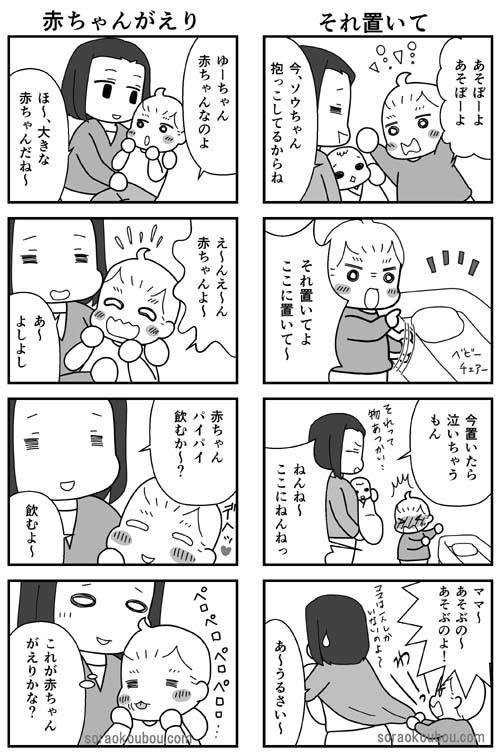 ・なかなか赤ちゃんを受け入れられないお兄ちゃんでした^_^;赤ちゃんをはじめて見た時から(何、これ、気に入らない)って顔したもんね。「ほら、ゆうちゃんの弟だよ~」と言うといつも微妙な顔つきになっていました。