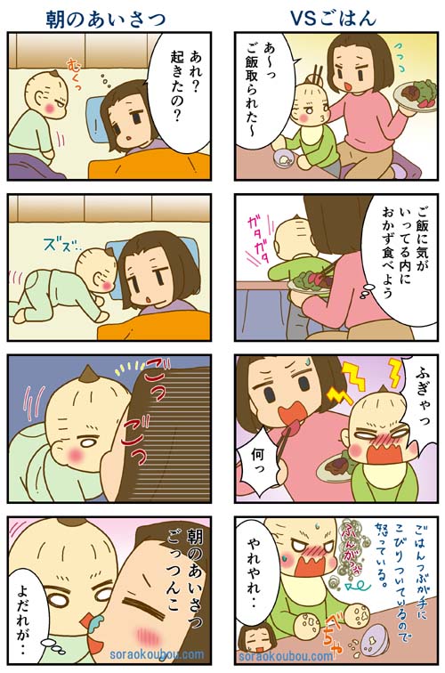 ・食事はいつも攻防戦、大人しく食べてくれることがない(^_^;)最後はママもやけくそになるw