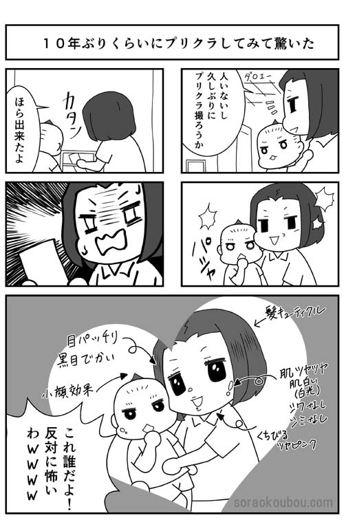 ・10年ぶりのプリクラがあまりに衝撃すぎて描いてしまったマンガです。今のプリクラはおばちゃんを寄せ付けない仕様になっているのだろうか、、若者だけのものなんだろうか、普通に撮れるプリクラはないんだろうか、、