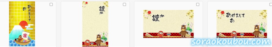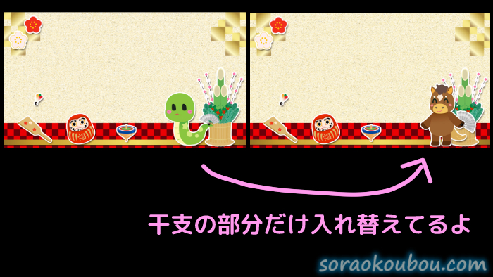 毎回1から素材を作ると、費用対効果が悪いので、テンプレートを作って干支だけ入れ替えています。